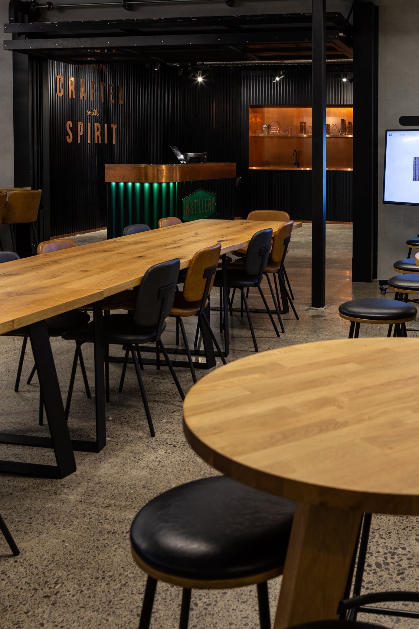 Throughout the Instillary project, a series of bespoke finishes and specialist fabrication techniques were developed, from the custom backlit resin desk—designed to evoke the translucency of a gin bottle—to the extensive use of solid copper sheeting and rustic timber. Unique’s team are highly experienced in solving construction challenges and bringing out-of-the-box ideas to life.